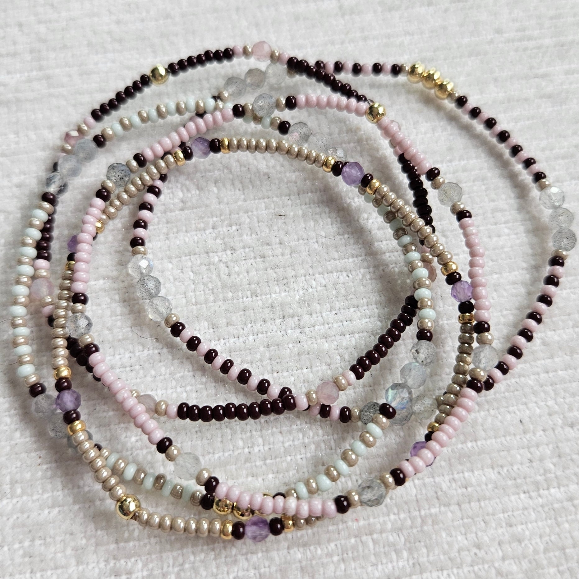 An earthy blend of deep brown, mink, nude, and mint beads, accented with faceted labradorite for protection and transformation, rose quartz for love and emotional healing, and amethyst for peace and intuition. A stack that shifts and shines with you.